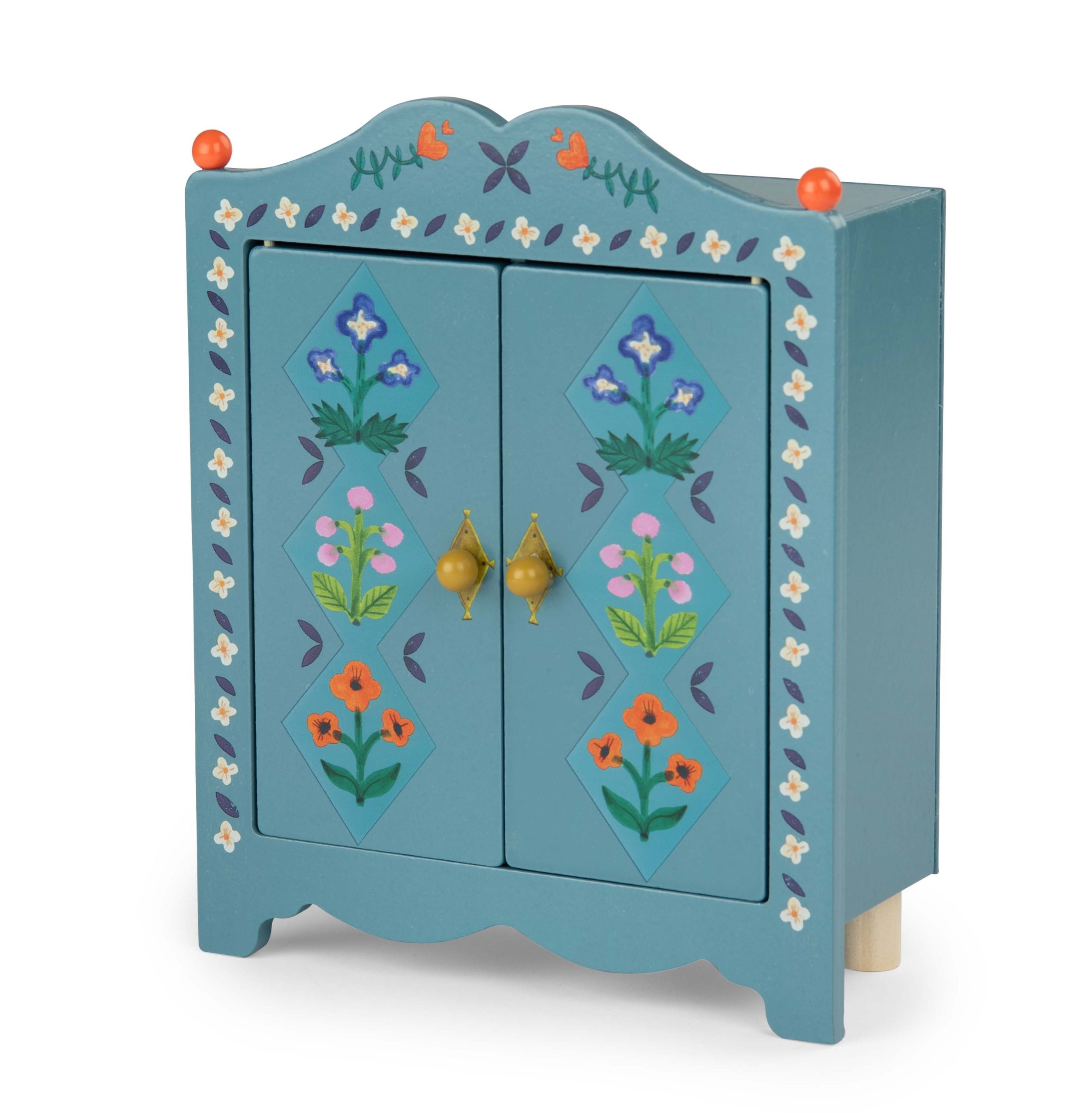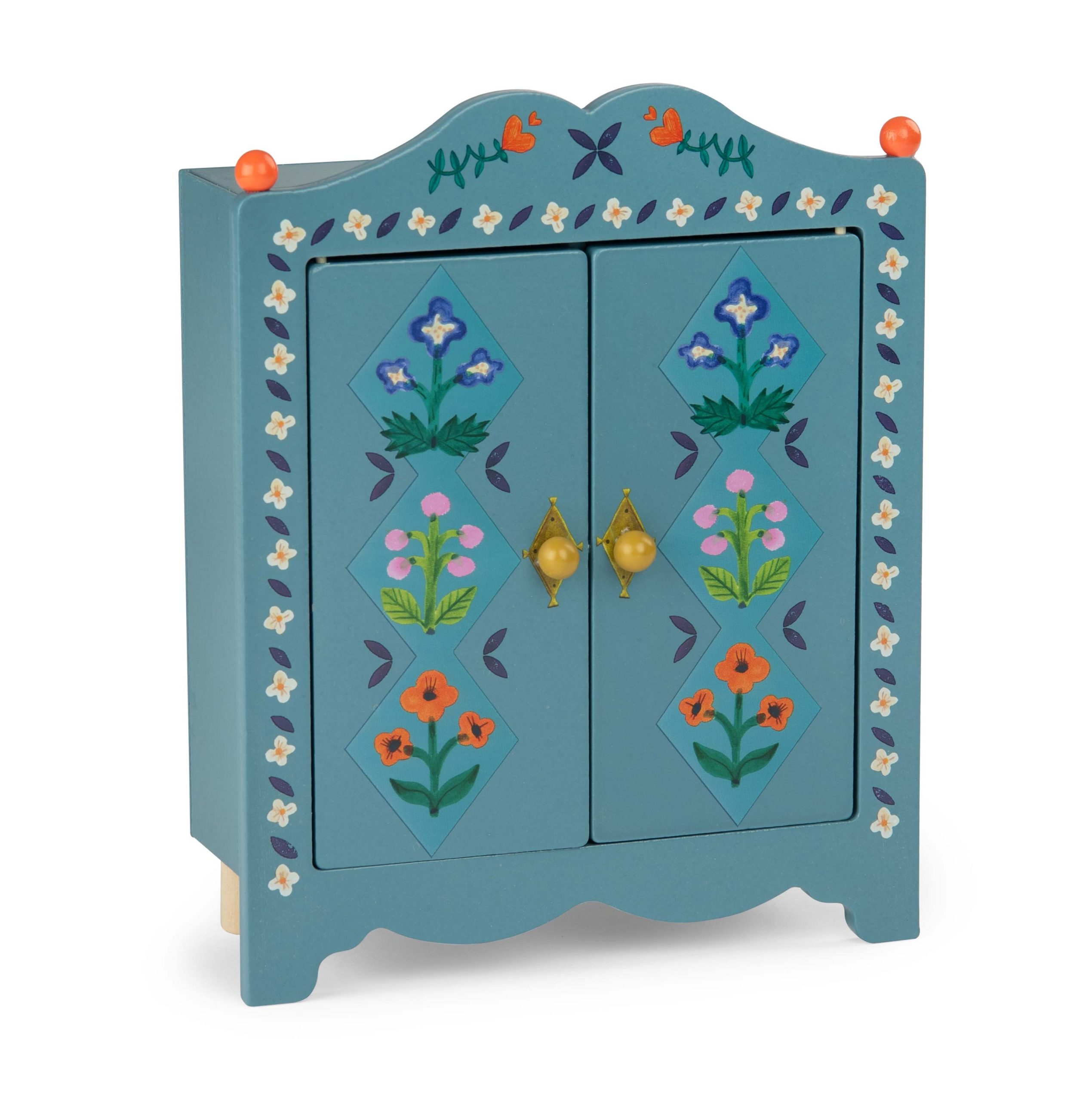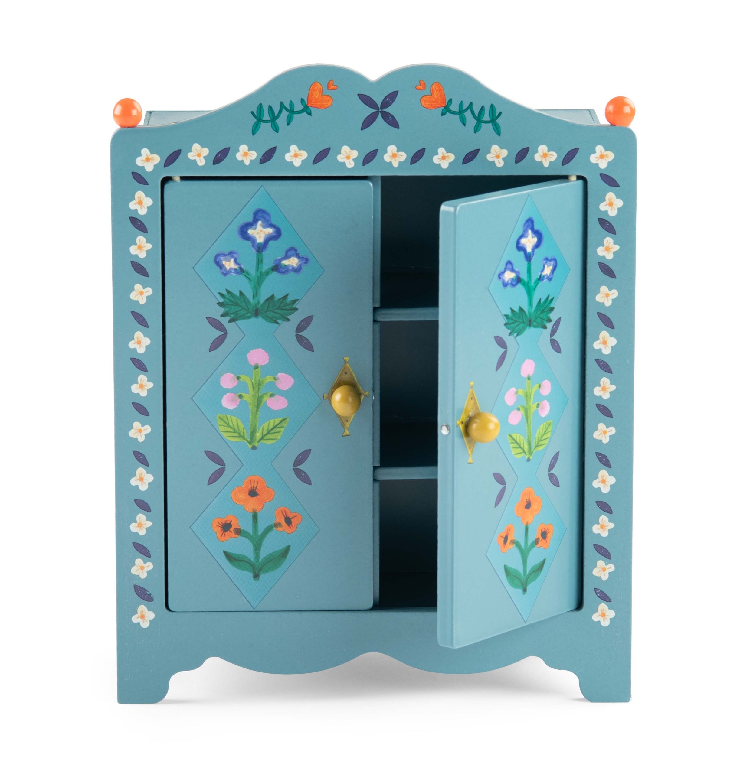 Pięknie zdobiona uroczymi kwiatuszkami w stylu retro. Drzwi szafy posiadają złote uchwyty, dzięki którym można dostać się do wnętrza z półkami. W zestawie znajdują się trzy wieszaki.