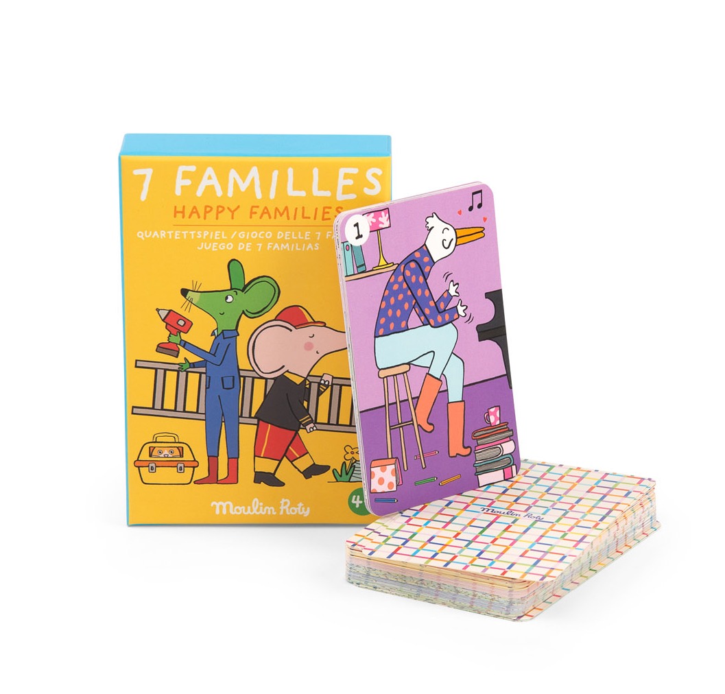Gra karciana 7 rodzin z kolekcji Les Loufoques francuskiej marki Moulin Roty. Pięknie ilustrowane karty przedstawiają zabawne zwierzątka przedstawiające różne grupy zawodów. Każda grupa składa się z 6 stworzeń, które trzeba połączyć. Kto jako pierwszy zbierze w całość jak najwięcej rodzin?