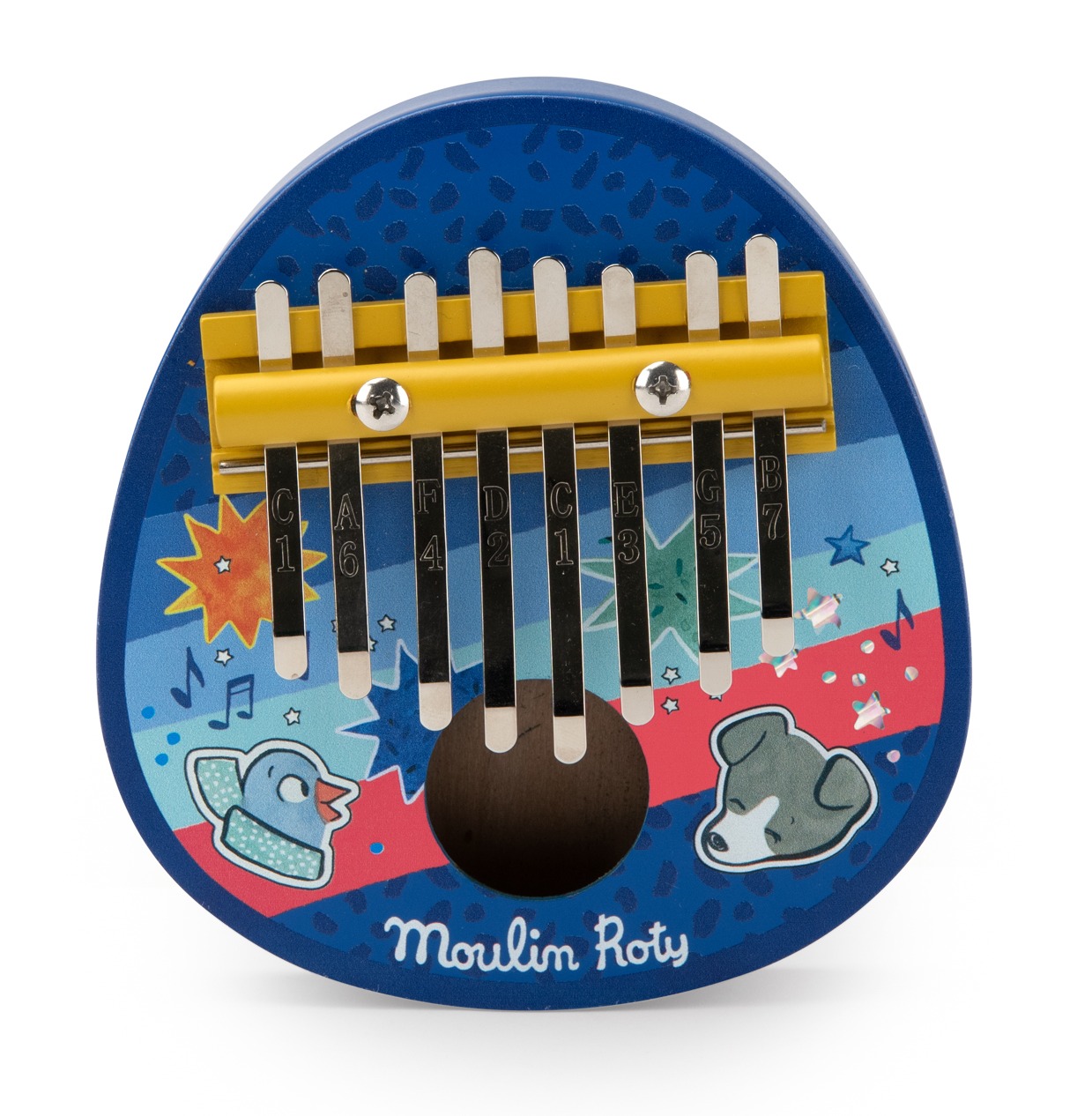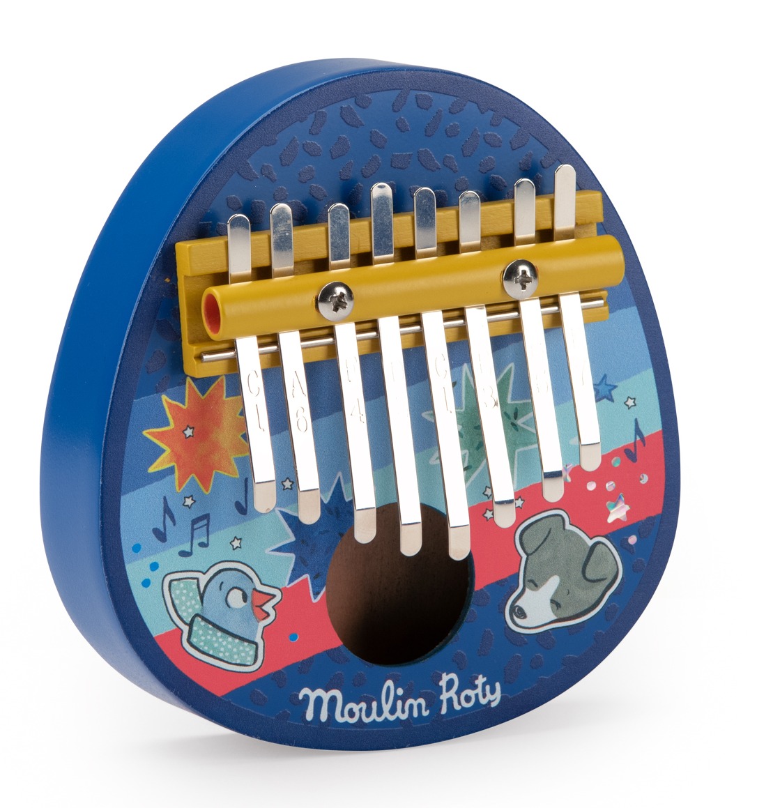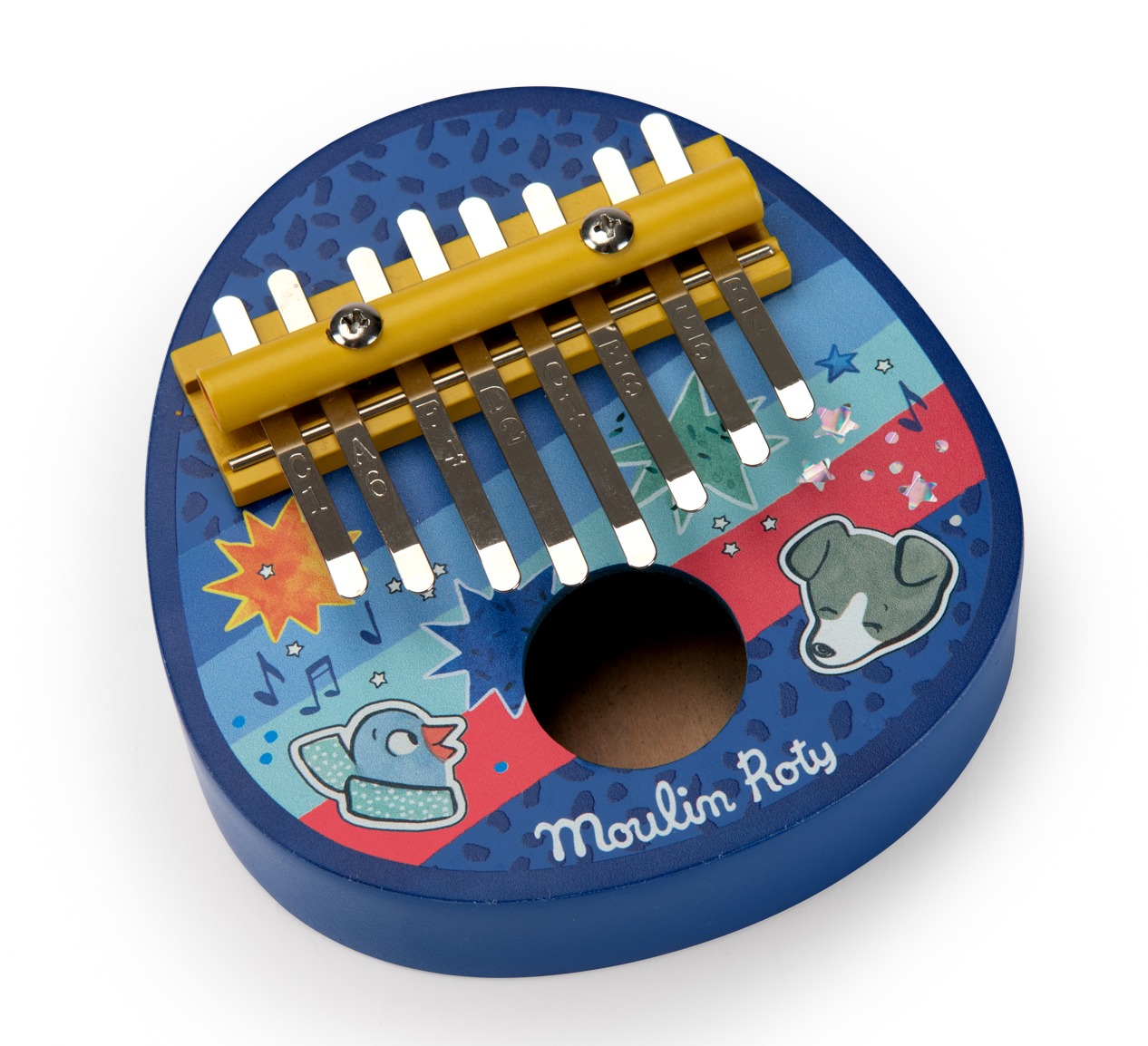 Malowana drewniana kalimba z 8 metalowymi klawiszami o miękkim brzmieniu z kolekcji „PUCE & PILOU” . Trzymaj instrument w obu rękach i naciskaj klawisze kciukami, aby wydobywać nuty. Już niedługo będziesz mógł grać swoje pierwsze melodie!