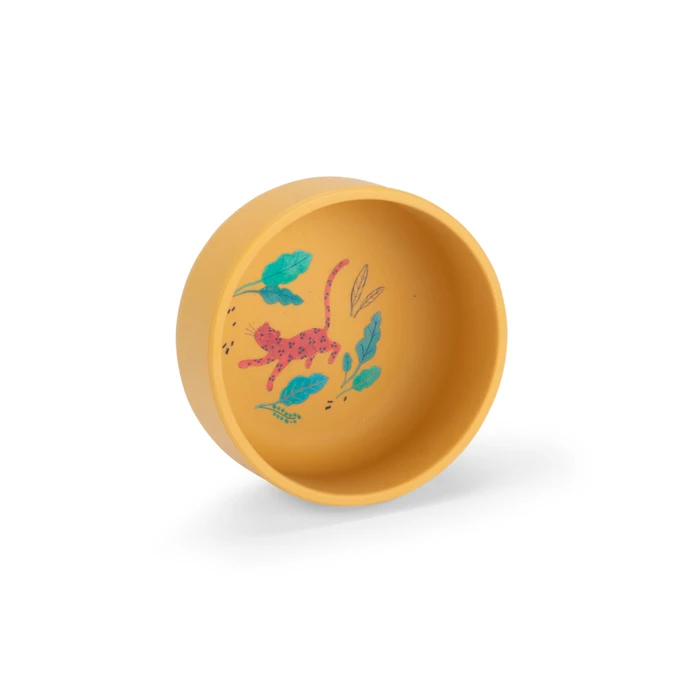 Silikonowe naczynia dla dzieci z kolekcji La Forêt Mawa zamienią każdy posiłek w niezwykłą przygodę. Zestaw zawiera żółtą miseczkę z wizerunkiem geparda, kremowy kubek z dziubkiem i dwoma uszami oraz brązowy talerzyk w kształcie głowy geparda z oczami i buzią.