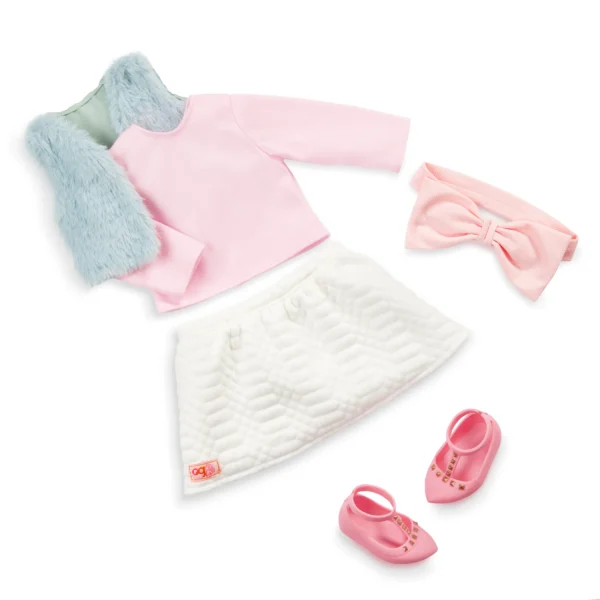 Paulina to klasyczna lalka 46 cm Our Generation w dopracowanej, stonowanej stylistyce. Jej zestaw łączy pastelowy róż z odcieniami śmietanki i błękitnoszarego futerka. Pikowana spódnica o delikatnej fakturze i miękka kamizelka tworzą spójną, elegancką całość.