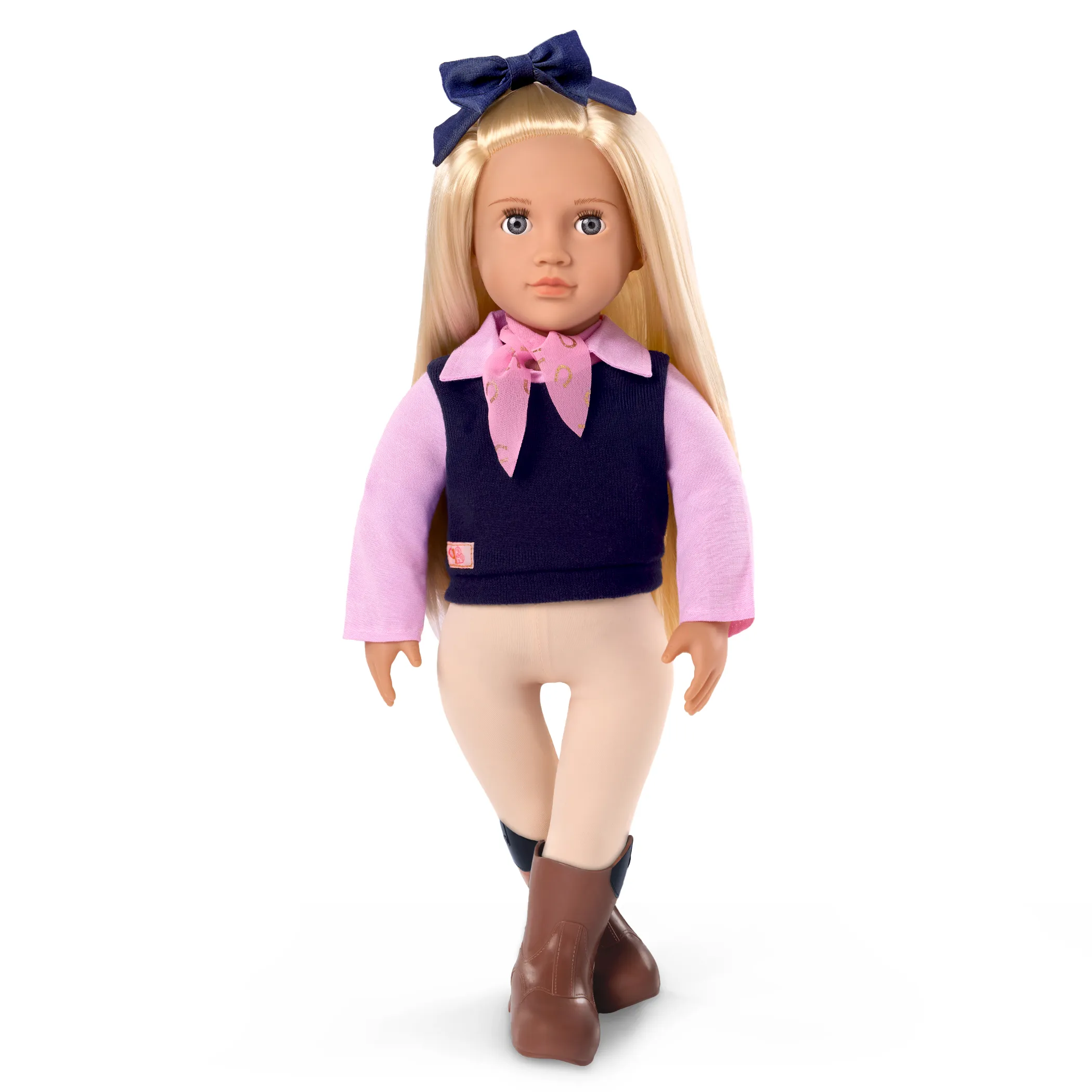 Modnie stylizowana lalka o wielkości 46cm marki Our Generation. Dżokejka – blondynka o ujmujących szaroniebieskich oczach.