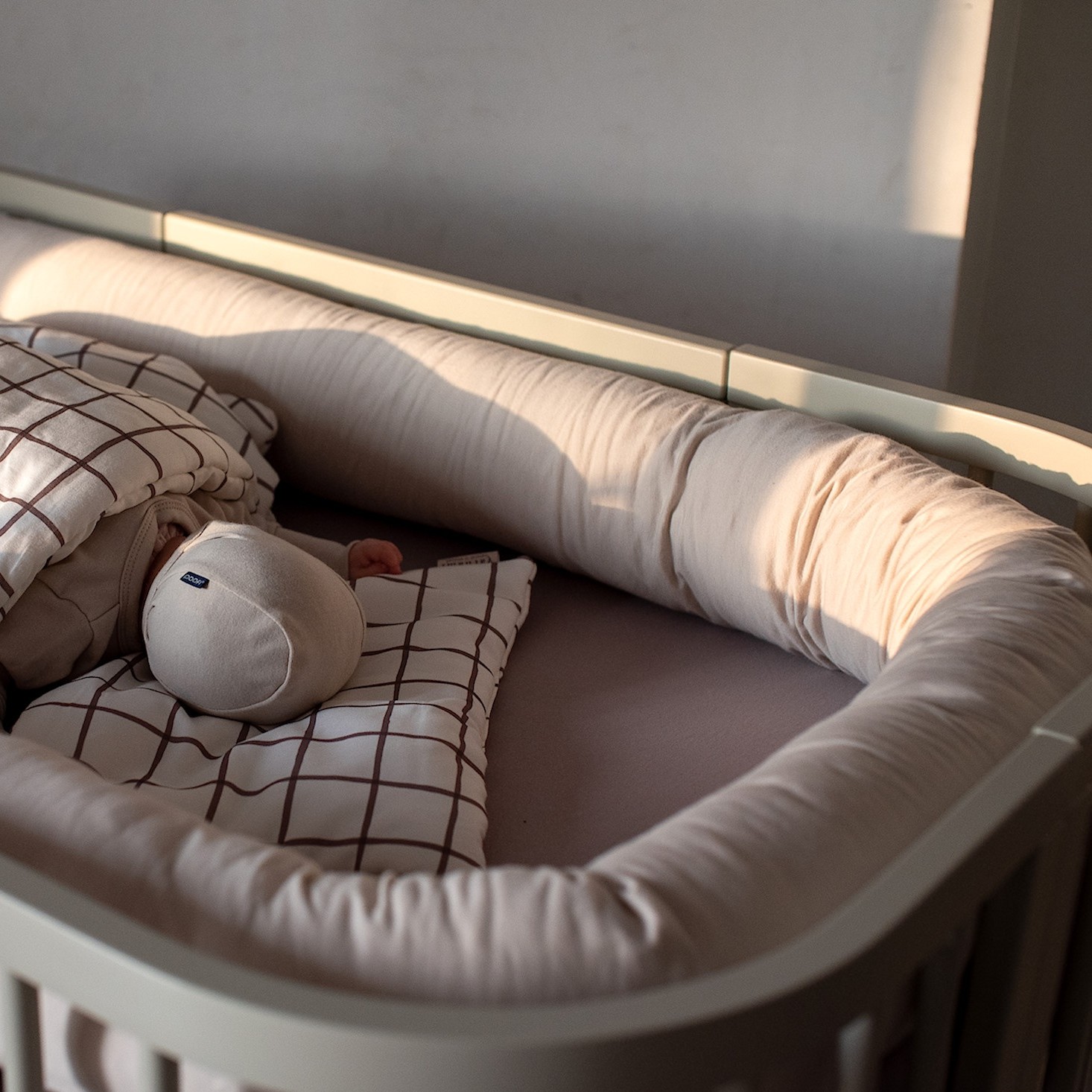 Miękki, funkcjonalny i elegancki ochraniacz do łóżeczka marki Poofi. To produkt 2w1, który łączy w sobie funkcję klasycznego ochraniacza z możliwością uformowania w kokon. Zapewnia dziecku bezpieczeństwo, komfort i przytulną przestrzeń do snu od pierwszych dni życia.