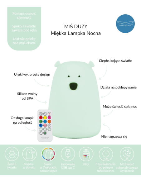 Lampka MIŚ DUŻY z pilotem Rabbit & Friends przypadnie do gustu każdemu maluchowi i zostanie niezastąpionym kompanem radosnych dni i spokojnych nocy na długi czas.