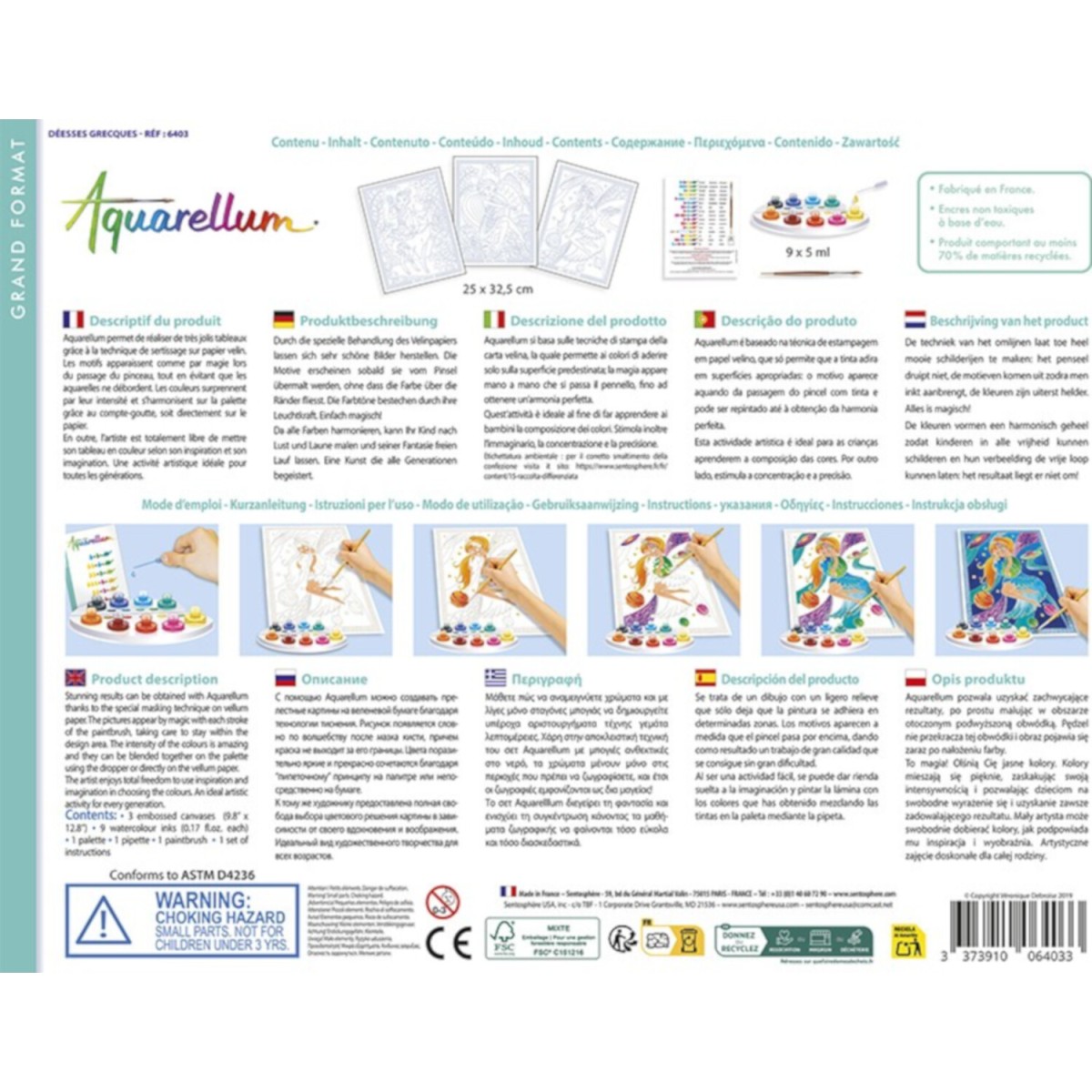 Zawartość: 3 zestawy obrazów 32,5 x 25 cm, 9 butelek zmywalnych, nietoksycznych akwareli, 1 wysokiej jakości pędzel do akwareli, 1 paleta do mieszania farb, 1 pipeta, 1 wielojęzyczna ulotka.