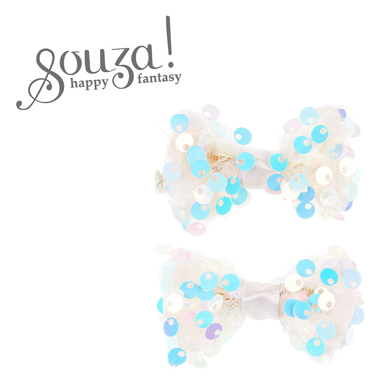 Komplet 2 spinek do włosów Tiki holenderskiej marki Souza! Na każdej z nich znajduje się biała tiulowa kokarda ozdobiona błękitnymi cekinami. Ząbkowane zaciski sprawiają, że ozdoby stabilnie trzymają się włosów. Idealne na przyjęcia i na co dzień. Doskonałe także jako prezent.