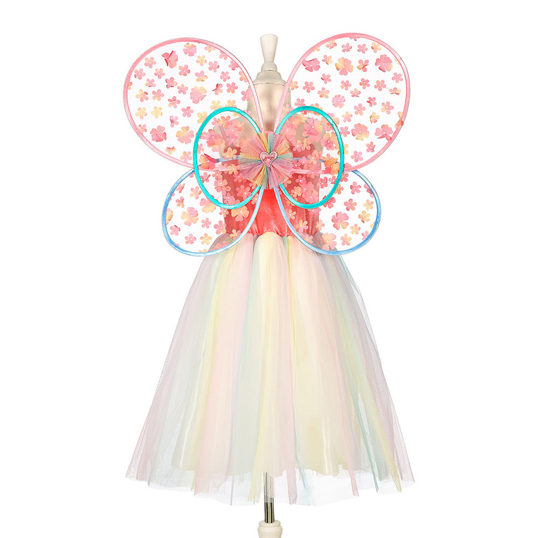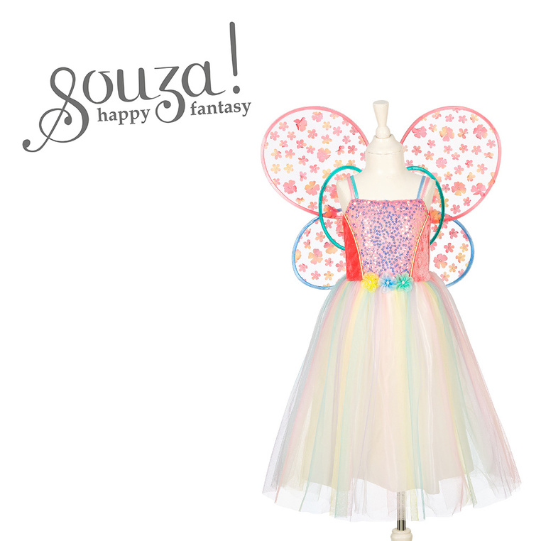 Kostium wróżki Flora marki Souza! to efektowna sukienka dla dziewczynki ze skrzydłami motyla. Sukienka ma klasyczny krój, górę na podwójnych ramiączkach i ozdobne kwiatki w pasie. Tęczowy tiul i haftowane detale dodają jej lekkości i blasku. Transparentne, wielowarstwowe skrzydła w odcieniach różu i niebieskiego uzupełniają całość. To idealny kostium na bal przebierańców, przyjęcia tematyczne czy urodziny. Świetnie sprawdzi się też jako prezent dla małej wróżki lub motylka.