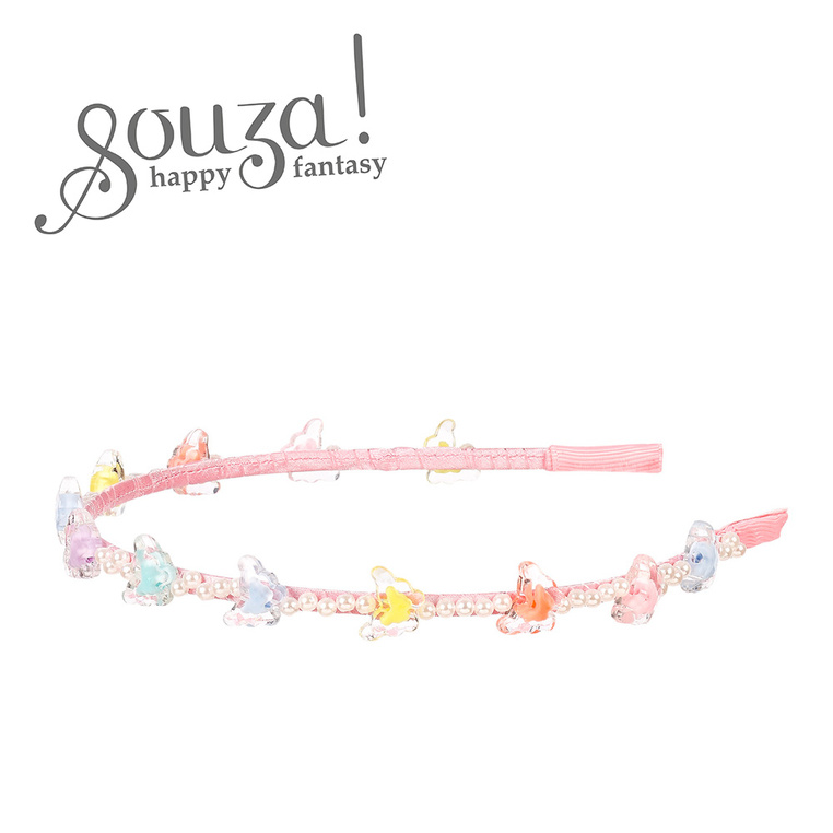 Opaska z perełkami i motylkami Solen holenderskiej marki Souza! Obciągniętą różową satynową wstążką opaskę zdobią drobne perłowe koraliki oraz kolorowe motylki. Opaska jest lekka, delikatna i przyjemna w noszeniu (ma szerokość 0,5 cm i nie uciska). Idealna zarówno na przyjęcia, jak i na co dzień. Sprawdzi się także jako stylowy prezent.