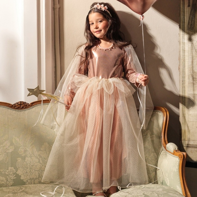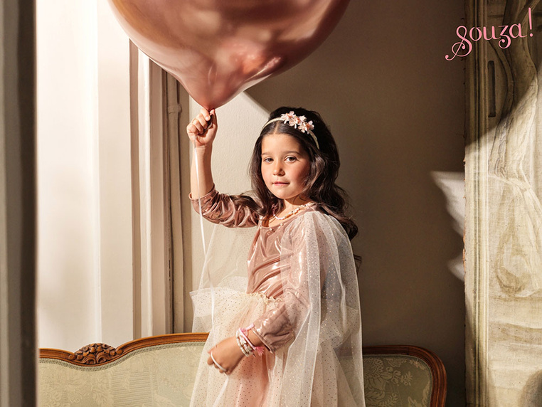 Sukienka wizytowa z długimi rękawami Philou holenderskiej marki Souza! to przepiękne, kunsztownie wykonane ubranie dla dziewczynki. Zachwyca dbałością o detale, ma klasyczny krój i gumkę w pasie, która zapewnia komfort noszenia. Góra sukienki posiada metaliczne, lśniące wykończenie, natomiast rękawy i spódniczka pokryte są dodatkową warstwą tiulu w drobne kropeczki, co nadaje całości bajkowego charakteru. W talii znajduje się dodatkowa tiulowa baskinka. To idealna sukienka na wszelkie przyjęcia (np. wesele czy urodziny), bale przebierańców lub Sylwestra. Sprawdzi się także jako prezent.