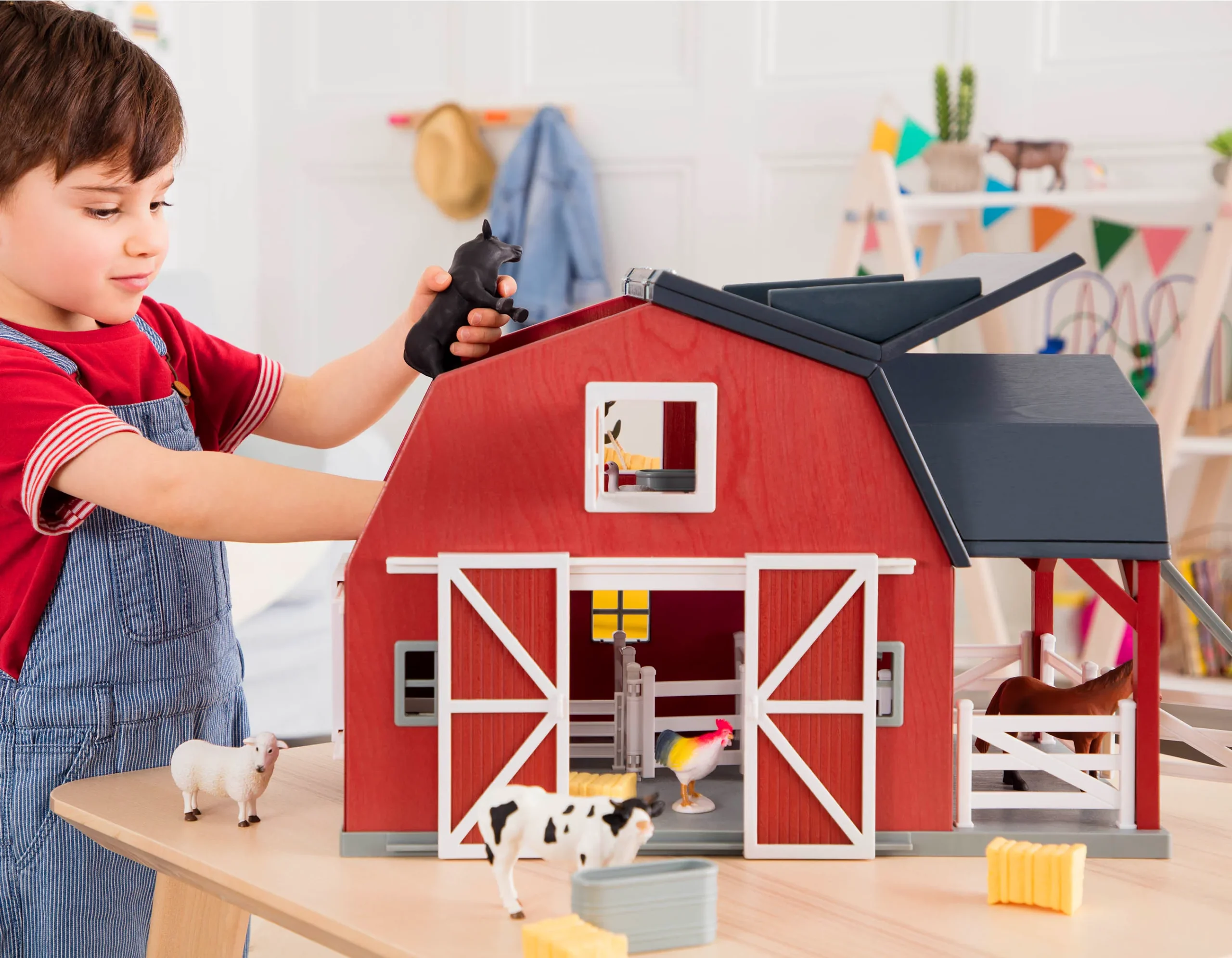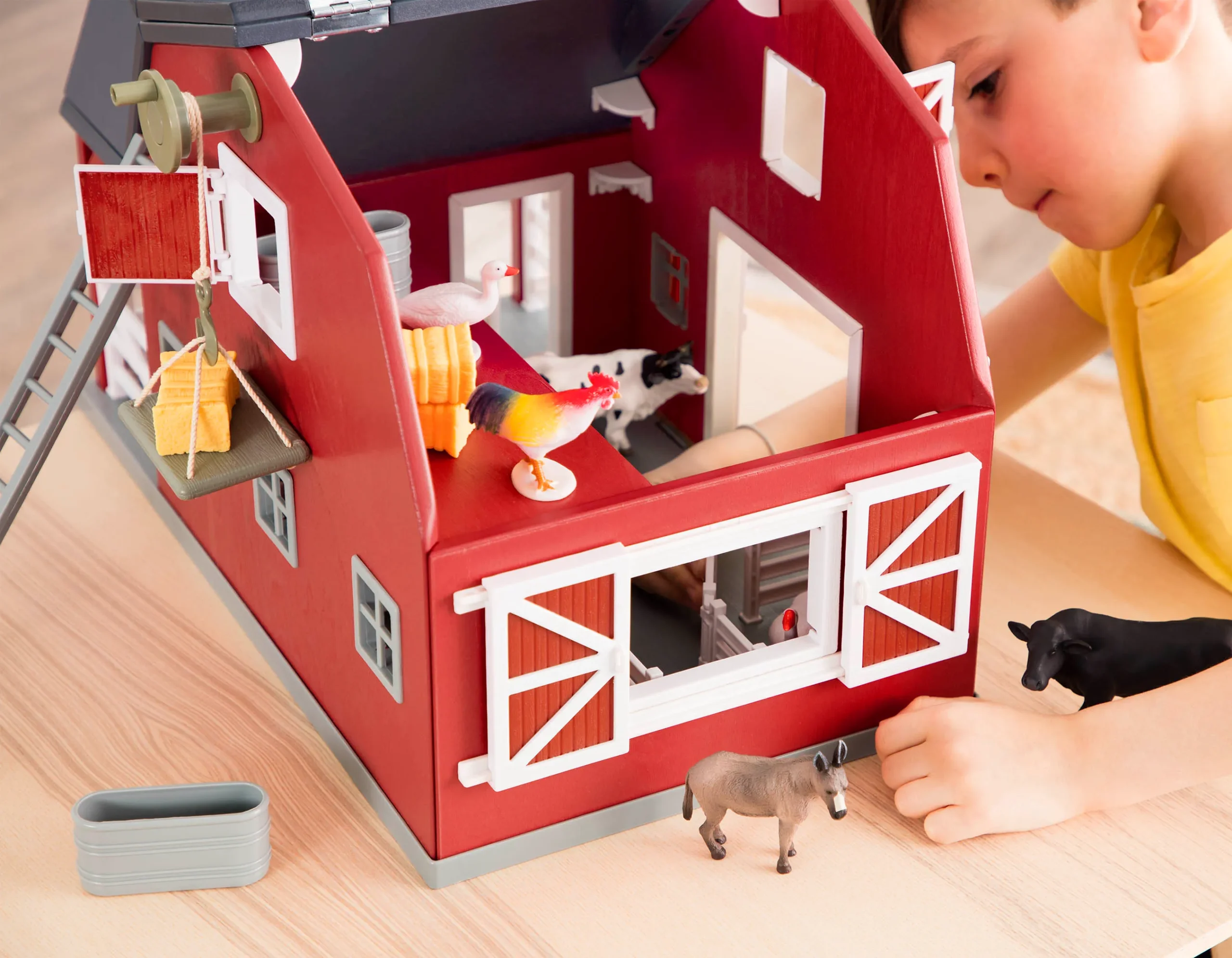 Stodoła działa jak scena teatralna — gotowa przyjąć ulubione figurki Terra i zamienić je w bohaterów opowieści, które rodzą się w wyobraźni, przez co w naturalny sposób inspiruje zabawę edukacyjną.