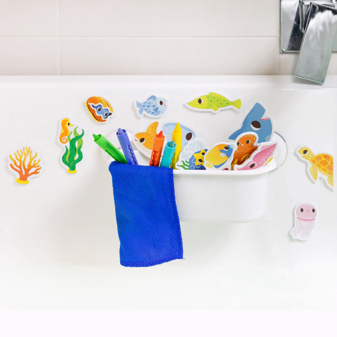 - 5 zmywalnych kredek – pozwalają dzieciom rysować bezpośrednio po wannie i płytkach; po zabawie wystarczy przetrzeć powierzchnię dołączoną ściereczką.