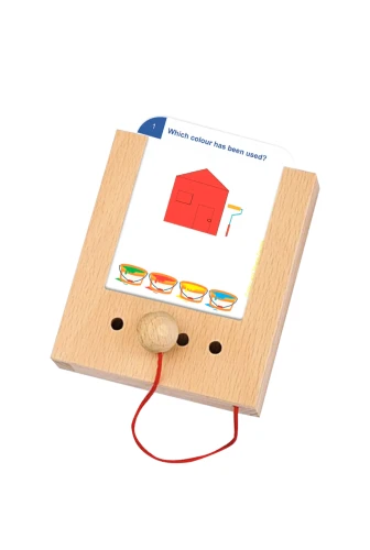 Zestaw zawiera 24 kolorowe karty, które oferują różnorodne ćwiczenia rozwijające spostrzegawczość, logiczne myślenie i umiejętność rozpoznawania kolorów i kształtów, ćwiczą motorykę małą dzięki pracy z drewnianym patyczkiem dołączonym do drewnianego pudełka WiemTo.