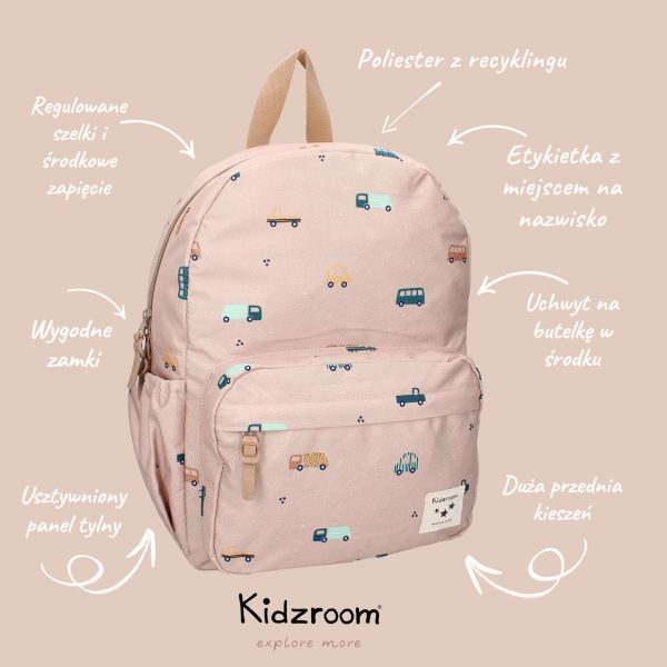 Ten uroczy beżowy plecak z nadrukiem w wesołe różne autka to doskonały wybór na każdą przygodę! Należący do czarującej kolekcji holenderskiej marki KIDZROOM, plecak