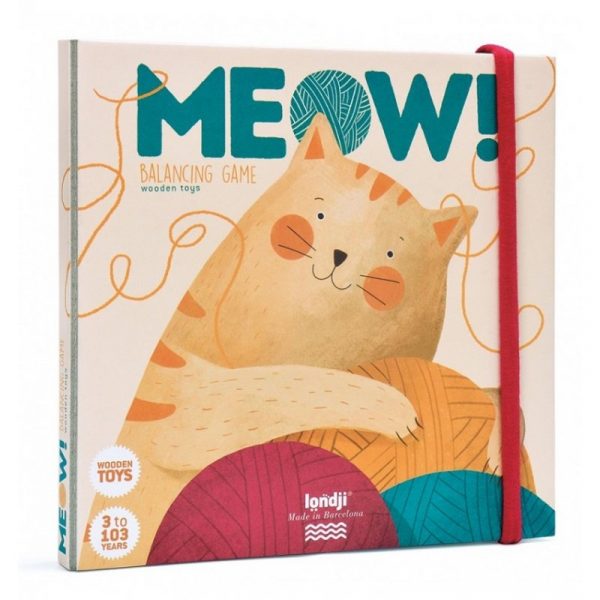 Drewniana zabawka dla dzieci z postacią sympatycznego kotka, który bawi się kolorowymi motkami. Kotek się lekko kołysze utrudniając ułożenie wszystkich,
