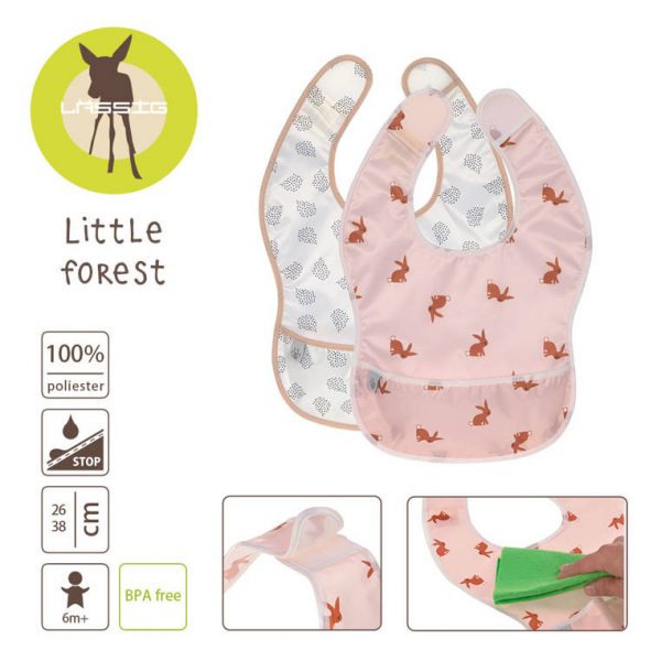 Zestaw dwóch praktycznych, łatwo zmywalnych śliniaków niemieckiej marki LASSIG. Są duże, transparentne, wykonane z wodoodpornego tworzywa. Miękka taśma i zapięcie