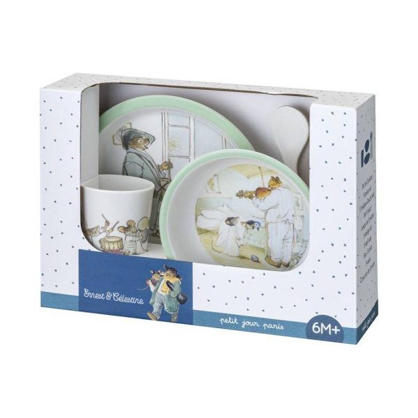 Komplet naczyń z silikonu francuskiej marki BEABA składa się z talerzyka, miseczki, kubka i łyżeczki treningowej. Wszystkie elementy zestawu charakteryzuje