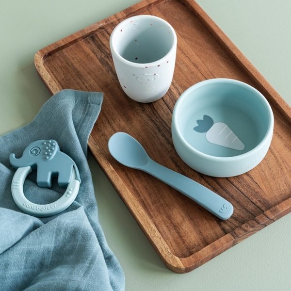 Silikonowy zestaw obiadowy idealny do podawania pierwszych posiłków. Praktyczny, antypoślizgowy zestaw obiadowy dla dziecka składa się z miseczki, kubka i