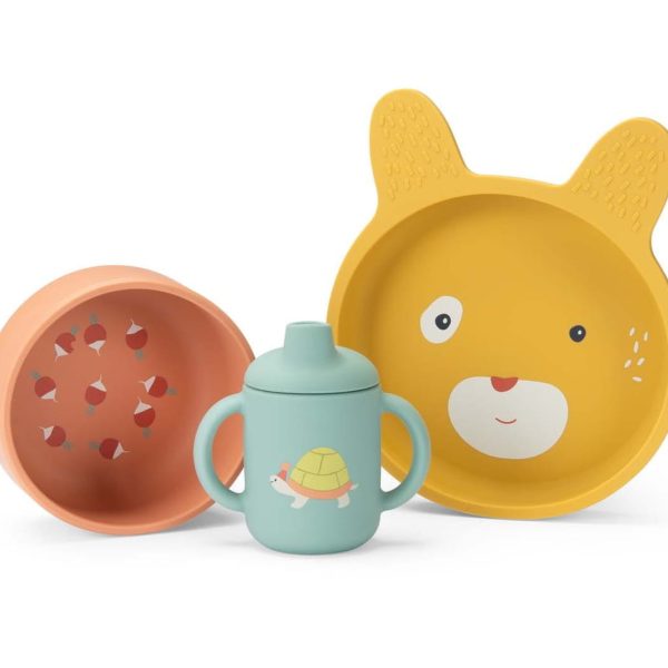 Silikonowe naczynia dla dzieci z kolekcji Trzy Małe Króliczki zamienią każdy posiłek w niezwykłą przygodę. Zestaw zawiera miseczkę ilustrowaną rzodkiewkami,