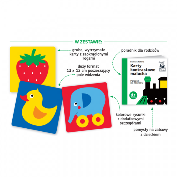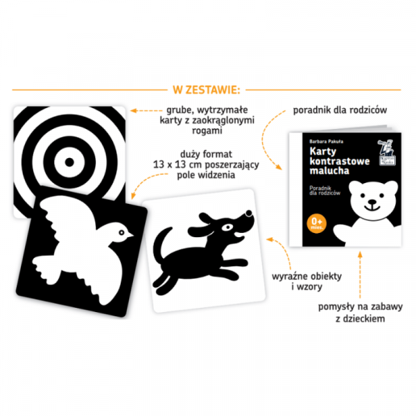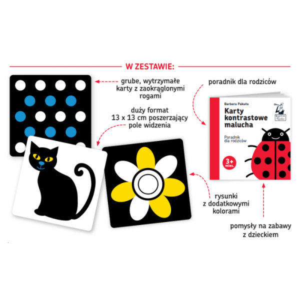 Zestaw z serii kontrastowej zawiera 12 dwustronnych czarno-białych kart oraz poradnik dla opiekunów ze wskazówkami terapeutki widzenia i optometrystki Barbary