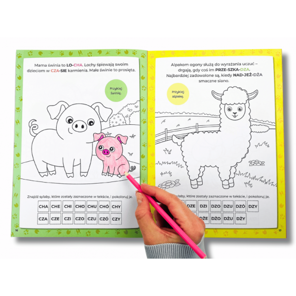 Kolorowanka sylabowa. Dzikie zwierzęta to książeczka prezentująca urokliwe zwierzątka: hipopotama, mrówkojada, zebrę, papugę, lwa i wiele innych! Na każdej stronie