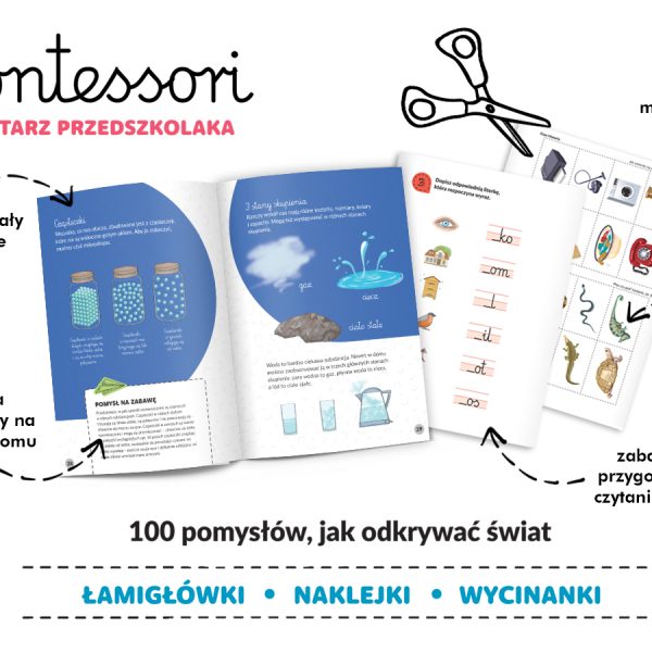 Montessori. Ćwiczenia przedszkolaka (4–6 lat) to bogato ilustrowana książka pełna zabaw i łamigłówek przygotowanych w duchu pedagogiki Montessori. Ćwiczenia dla