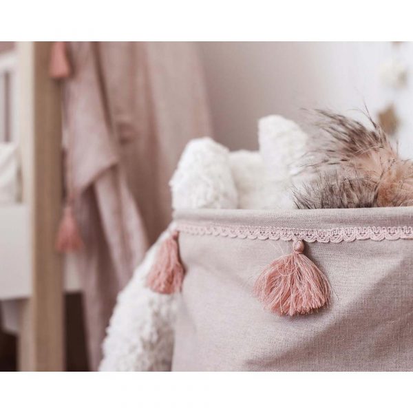 Stylowy pastelowo-różowy z uroczymi frędzlami, kosz na zabawki i inne skarby Twojego malucha. Niezwykle pojemny i funkcjonalny, będzie nieodzownym elementem