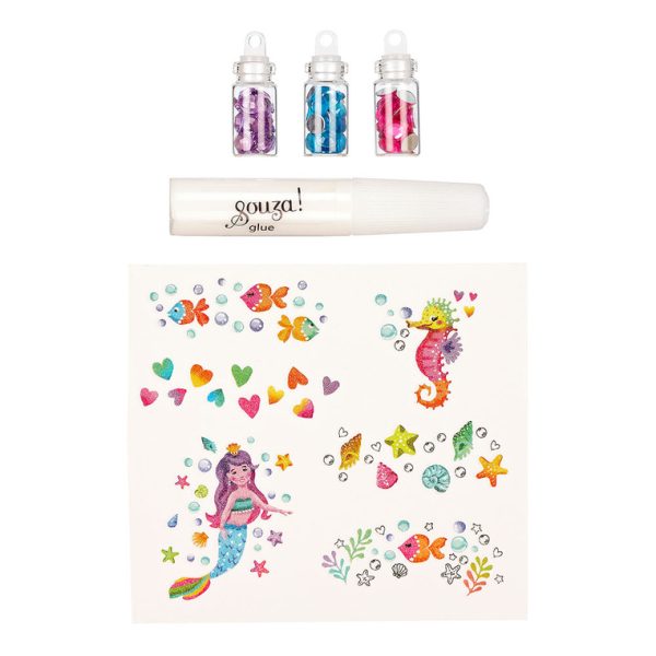 Zestaw do tworzenia zmywalnych tatuaży brokatowych z kryształkami dla dzieci Syrenka holenderskiej marki Souza! Zapakowany w kartonowe pudełeczko z okienkiem,