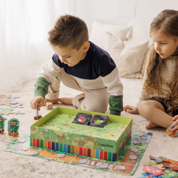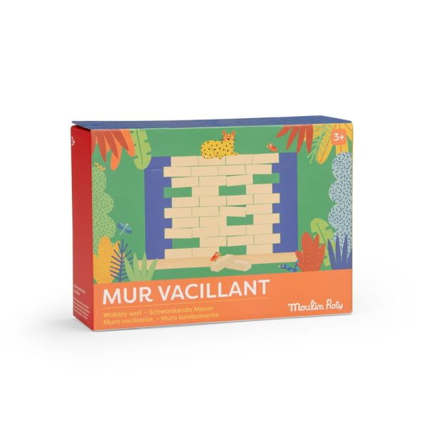 Lampart Leon przeciąga się leniwie na szczycie drewnianego muru z klocków, nieświadomy zagrożenia. Zgromadzeni wokół gracze wyciągają po kolei cegiełki,