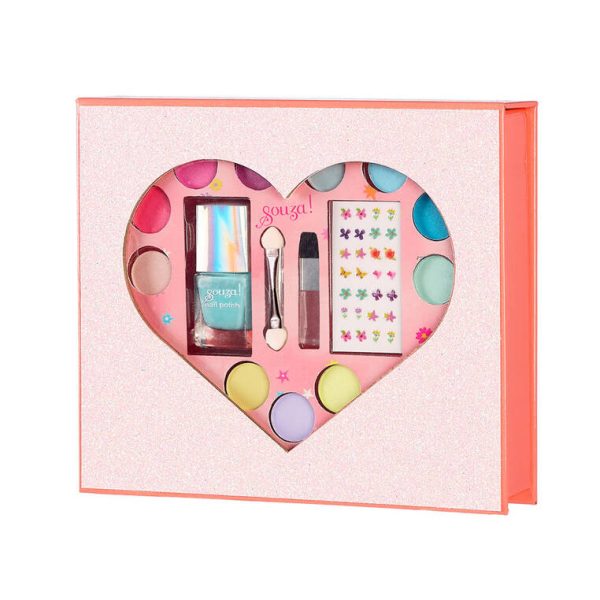 Duży zestaw kosmetyków do makijażu dla dzieci Luxe holenderskiej marki Souza! Zawiera: 3 lakiery do paznokci (jasnoróżowy, jasnoliliowy i transparentny