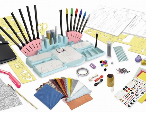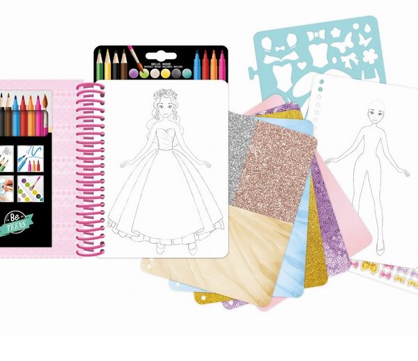 Twórz i rysuj własne, niepowtarzalne stroje księżniczek. Wykorzystaj samoprzylepne tkaniny, aby ożywić swoje projekty. Narysuj ubrania za pomocą szablonów, a