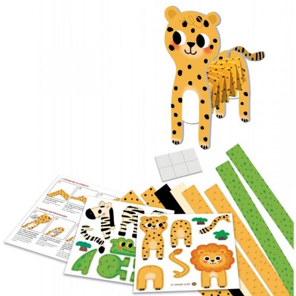 Dzięki temu zestawowi artystycznemu dzieci będą mogły stworzyć ładne zwierzątka, składając wydrukowane paski papieru. Montaż nie wymaga kleju. Zestaw zawiera: