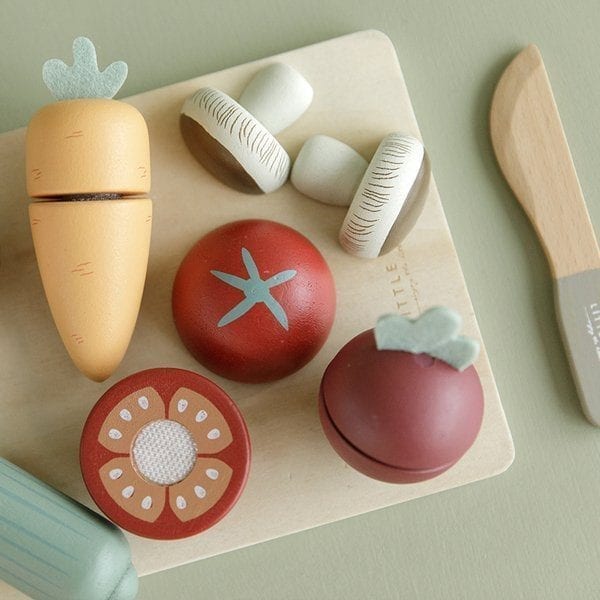 Zestaw składający się z warzyw, takich jak: marchewka, ogórek, pomidor, cebula, burak i pieczarki oraz deseczka wraz z bezpiecznym, drewnianym nożykiem. Wszystko