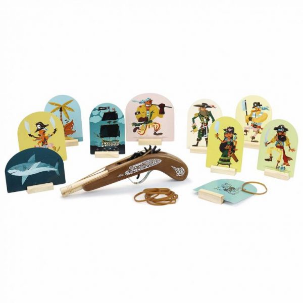 Piraci to gra zręcznościowa z drewnianym pistoletem na gumki, marka Vilac Gra dla małego pirata składa się z drewnianego pistoletu