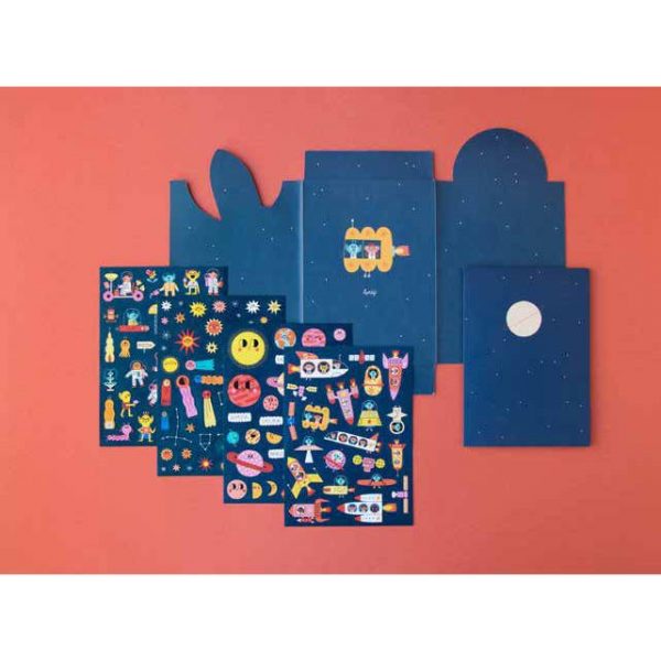 Naklejki wielokrotnego użytku z tłem, Kosmos Zdejmowalne naklejki to bardzo lubiana zabawa, która wesprze u Twojego malucha koordynację ręka – oko, pomoże