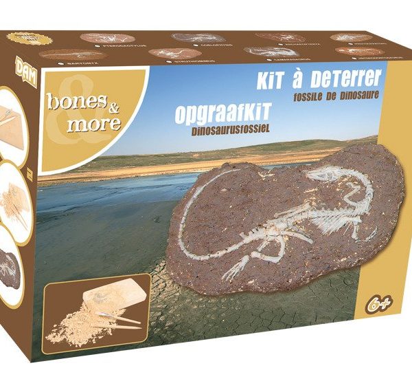 Zestaw dla młodego naukowca. W bryle ukryty jest w kamieniu szkielet dinozaura, który należy wykopać przy pomocy załączonych do zestawu