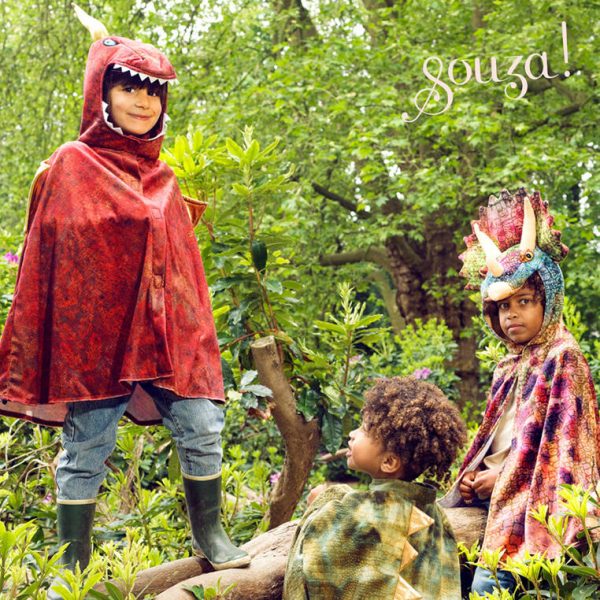 Kostium peleryna Triceratops z dużym zabudowanym kapturem, tworzącym jednocześnie maskę dinozaura holenderskiej marki Souza! to przepiękne przebranie dla chłopca. Ma