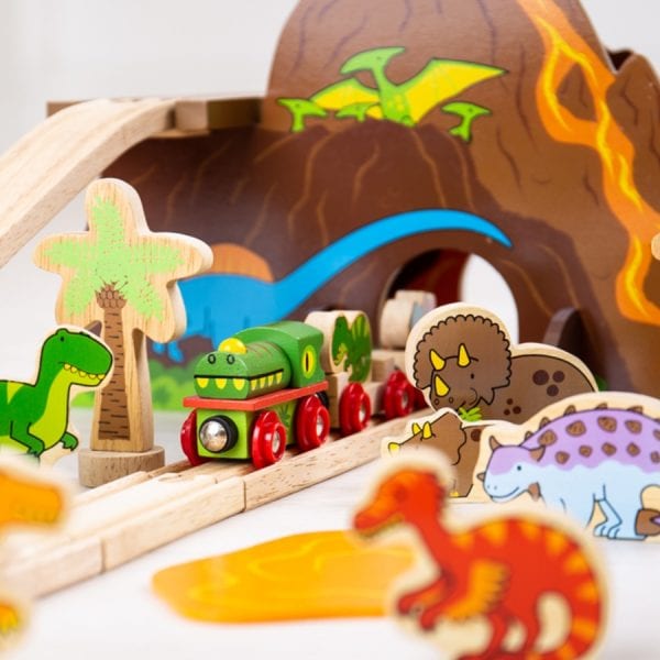 Wspaniały zestaw – drewniana kolejka w tematyce dinozaurów. Elementy prehistorycznego krajobrazu, figurki dinozaurów, pociąg, a całość to 49 części. Zestaw