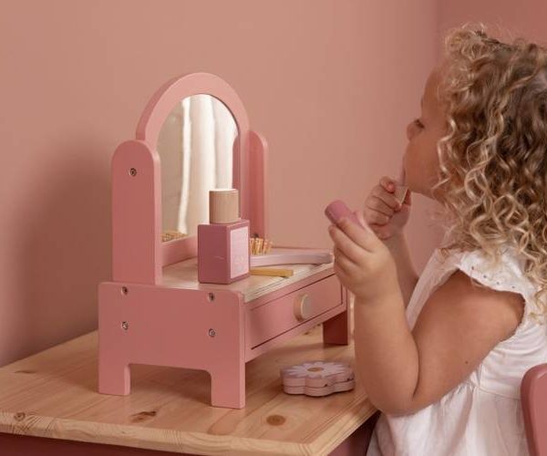 Drewniana toaletka od Little Dutch. Piękna różowa drewniana toaletka dla dzieci, zachęca do pomysłowej i niekończącej się zabawy. W toaletce znajduje się