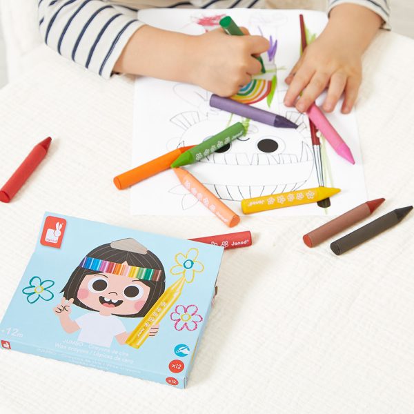 Zestaw 6 kredek woskowych francuskiej marki JANOD w pięknych, intensywnych kolorach. Są krótkie z poręcznymi okrągłymi uchwytami, które również kolorują.