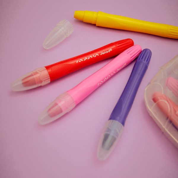 Zestaw 10 kredek żelowych francuskiej marki JANOD w pięknych, intensywnych kolorach. Są poręczne (ergonomiczny wcięty kształt), z szerokimi końcówkami, a