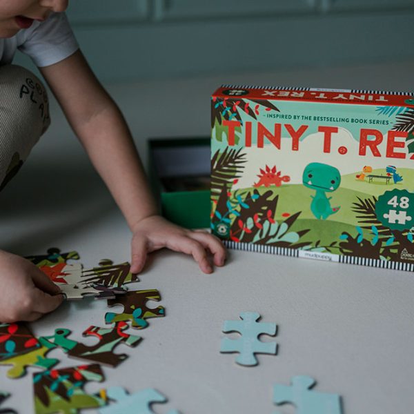 Puzzle Tiny T-Rex amerykańskiej marki MUDPUPPY składają się z 48 poręcznych elementów, po ułożeniu przedstawiających malutkiego uroczego tyranozaura w pradawnej