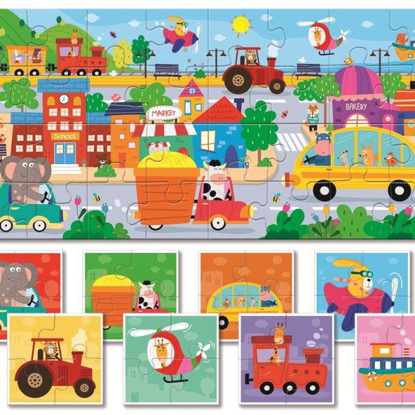 16-elementowe puzzle, które po ułożeniu przedstawiają sielski obrazek wiejskiego gospodarstwa, w którym urocze zwierzątka zajmują się swoimi obowiązkami. Puzzle są