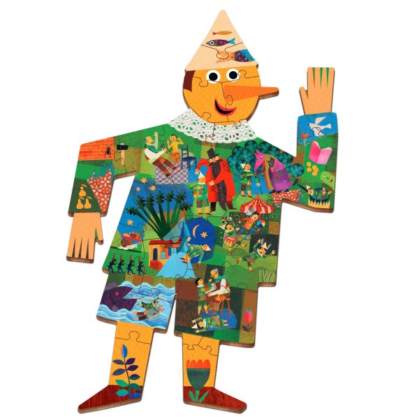 OPOWIEŚĆ NABIERA KSZTAŁTÓW W MIARĘ ŁĄCZENIA DUŻYCH DREWNIANYCH ELEMENTÓW UKŁADANKI. Całość tworzy postać słynnego pajacyka Pinokia o wielkości około 35x24cm,