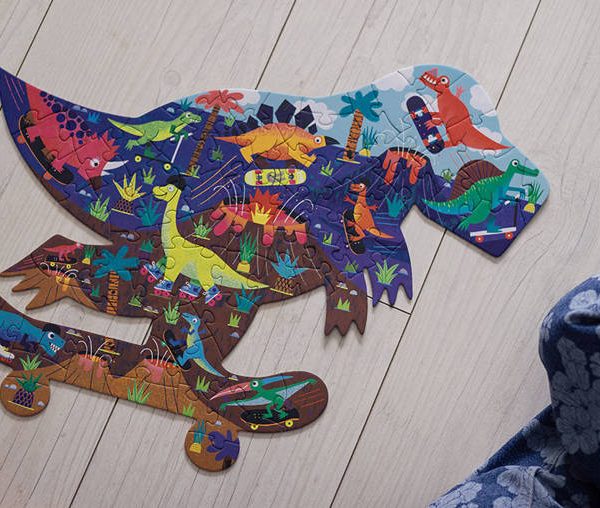 Układanka magnetyczna Dinozaury od Auzou. Zestaw zawiera 50 kolorowych magnesów z dinozaurami oraz rozkładaną dwustronną książeczkę magnetyczną na której można