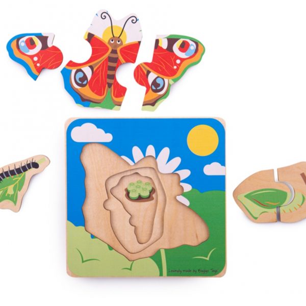 Starannie zaprojektowane drewniane puzzle warstwowe marki BIGJIGS. Trzy warstwy układanki pokazują cykl życia MOTYLA. Zabawka wykonana z wysokiej jakości drewna.