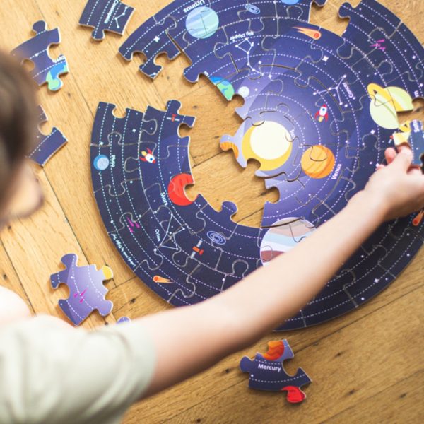 Starannie zaprojektowane drewniane puzzle podłogowe marki BIGJIGS. Dla uatrakcyjnienia układanki, obrazek jest okrągły. Składa się z 50 elementów. Zabawka wykonana