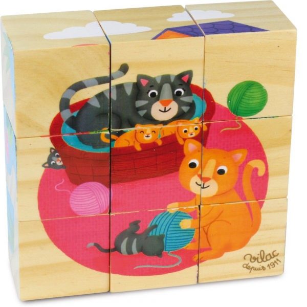 Układanka z 9 drewnianych klocków sześcianów, przedstawiająca rysunki ze zwierzętami. Zabawka rozwija koncentrację, umiejętność obserwacji, ćwiczy małą motorykę rąk. Klocki