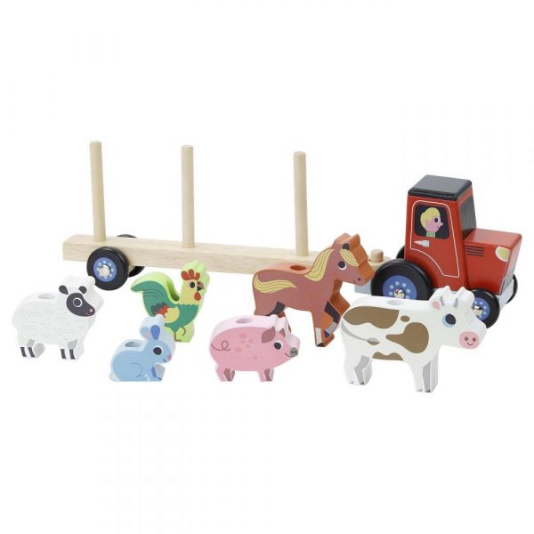 Pomysłowa zabawka marki Vilac zaprojektowana przez Ingelę Arrhenius. Drewniany pojazd – ciągnik ze zwierzątkami z farmy. Zwierzęta można oczywiście zdejmować