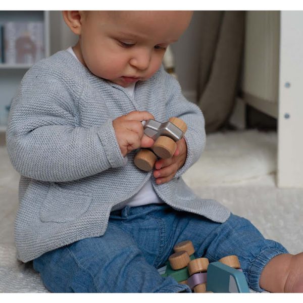 Zestaw 8 drewnianych pojazdów dla najmłodszych dzieci. Pojazdy mają kształt ułatwiający zabawę maluchom, kółka bardzo łatwo działają. Pojazdy spakowane w