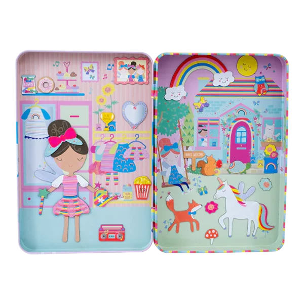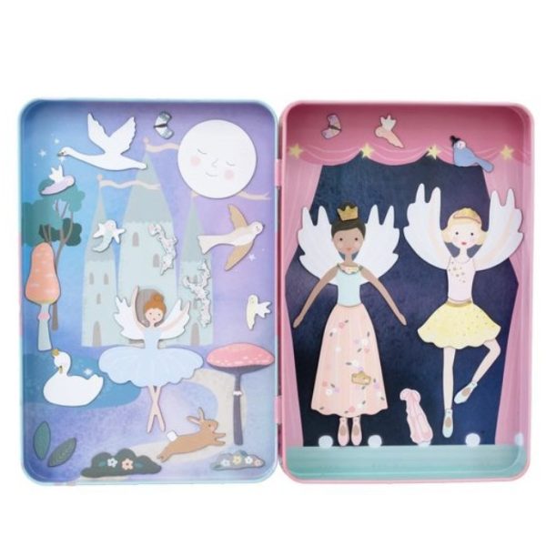 Magnetyczna układanka z motywem Baletnic zawiera ponad 50 zabawnych magnetycznych elementów i dwie bajecznie kolorowe scenki znajdujące się na wewnętrznych